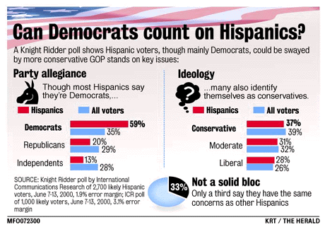 Para ver este documento en español, oprima aquí. The Miami HeraldCourting The Hispanic VoteNew poll shows as a voting bloc, Latinos defy definitionby STEVEN THOMMAJuly 23, 2000
